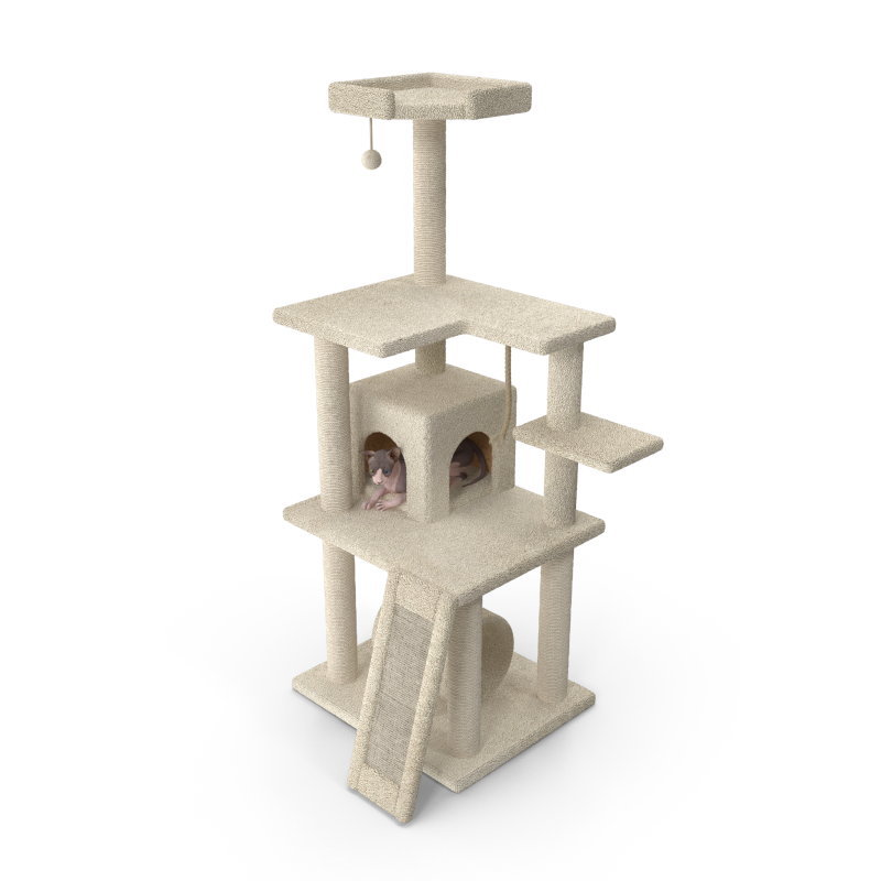 Most cat trees have at least one built-in scratching post for cats to rip into. Cats scratch to remove the dead part of their nails and stretch their muscles. They also scratch to mark their territory using the scent glands in their paws.